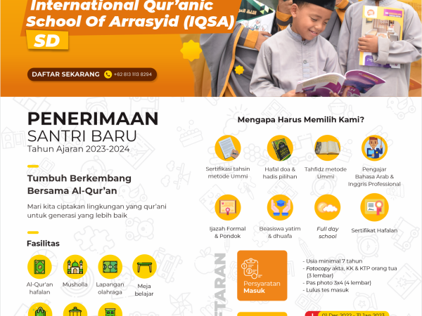 Pesantren Tahfidz Ar–Rasyid Pare membuka kembali progam baru untuk anak-anak di jenjang Sekolah Dasar (SD) untuk mewujudkan cita-cita mereka menjadi Hafidz Qur’an dalam Progam INTERNASIONAL AL QUR’ANIC SCHOOL Of AR-RASYID SEKOLAH DASAR (IQSA SD).